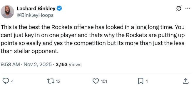 正如火箭记者Lachard Binkley赛后所说,火箭队本场打出了让人惊叹的进攻表现,已经记不清休城上一次打出这种表现是什么时候。