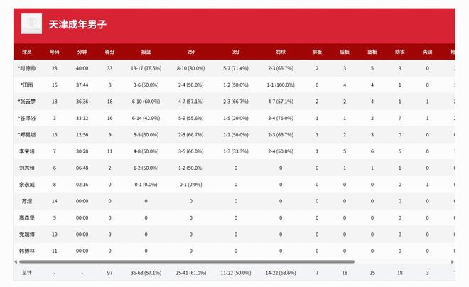 天津男篮时德帅33分5板3助,张云梦18分4板1助;北京男篮翟晓川19分8板2助,张帆18分1助。