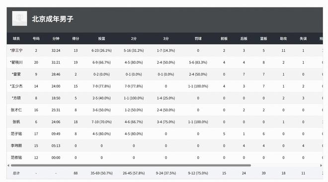 北京男篮:翟晓川19分8板2助,张帆18分1助1断,王少杰15分7板1助,廖三宁13分5板10助,范子铭8分6板,张才仁8分2板,方硕5分2助。