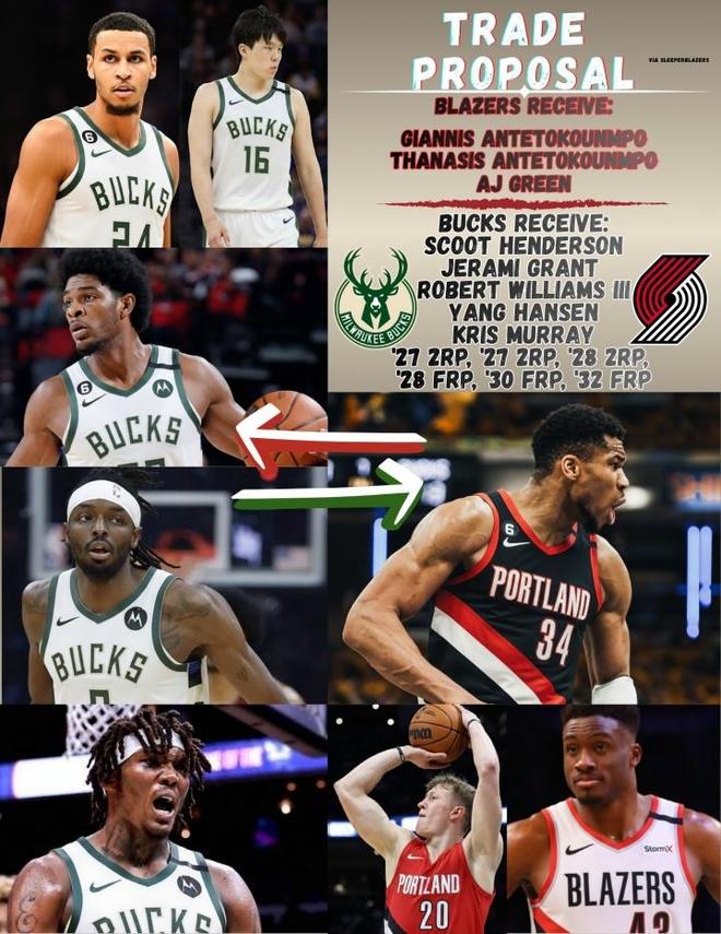 近日,开拓者媒体SleeperTrailBlazers提出了一则引人注目的交易建议。在这一交易方案中,开拓者队将得到扬尼斯·阿德托昆博(字母哥)、萨纳西斯·阿德托昆博(字母哥哥)以及A.J.格林。而雄鹿队则会获得斯库特·亨德森、杰拉米·格兰特、罗伯特·威廉姆斯三世、杨瀚森、克里斯·穆雷等球员,此外还包括2028年首轮签、2030年首轮签、2032年首轮签、2027年次轮签x2、2028年次轮签。